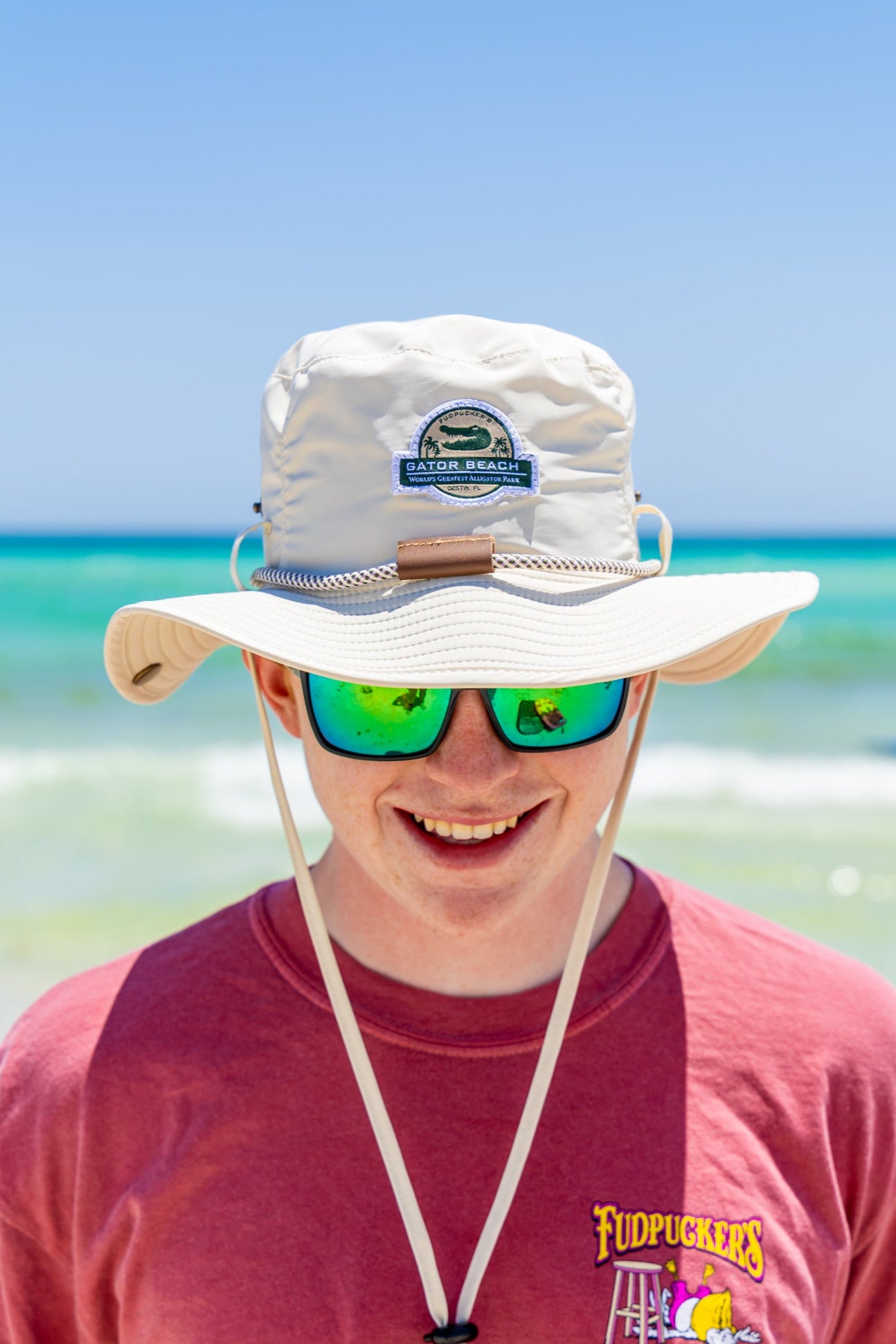 It features a secure chin cord with an adjustable toggle to keep it in place—whether you're wrangling gators or just lounging by the water. Snap-up sides add a versatile look and airflow, while the custom Gator Beach patch on the front makes it uniquely yours. Perfect for beach days, adventures, and everyday protection from the Florida sun.