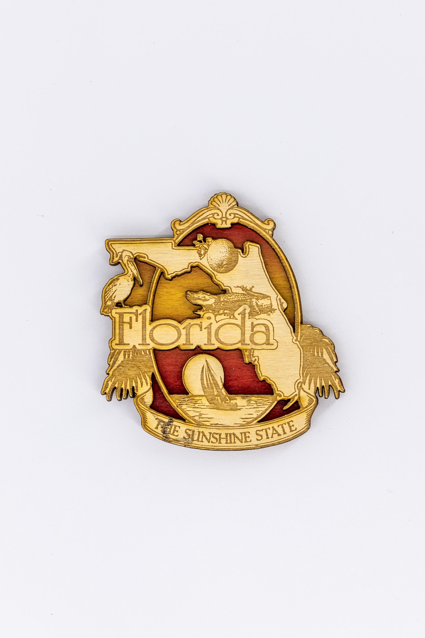 Celebrate your Florida getaway with this Fudpucker's wooden magnet! Shaped like the Sunshine State itself, this charming souvenir is a mini masterpiece!